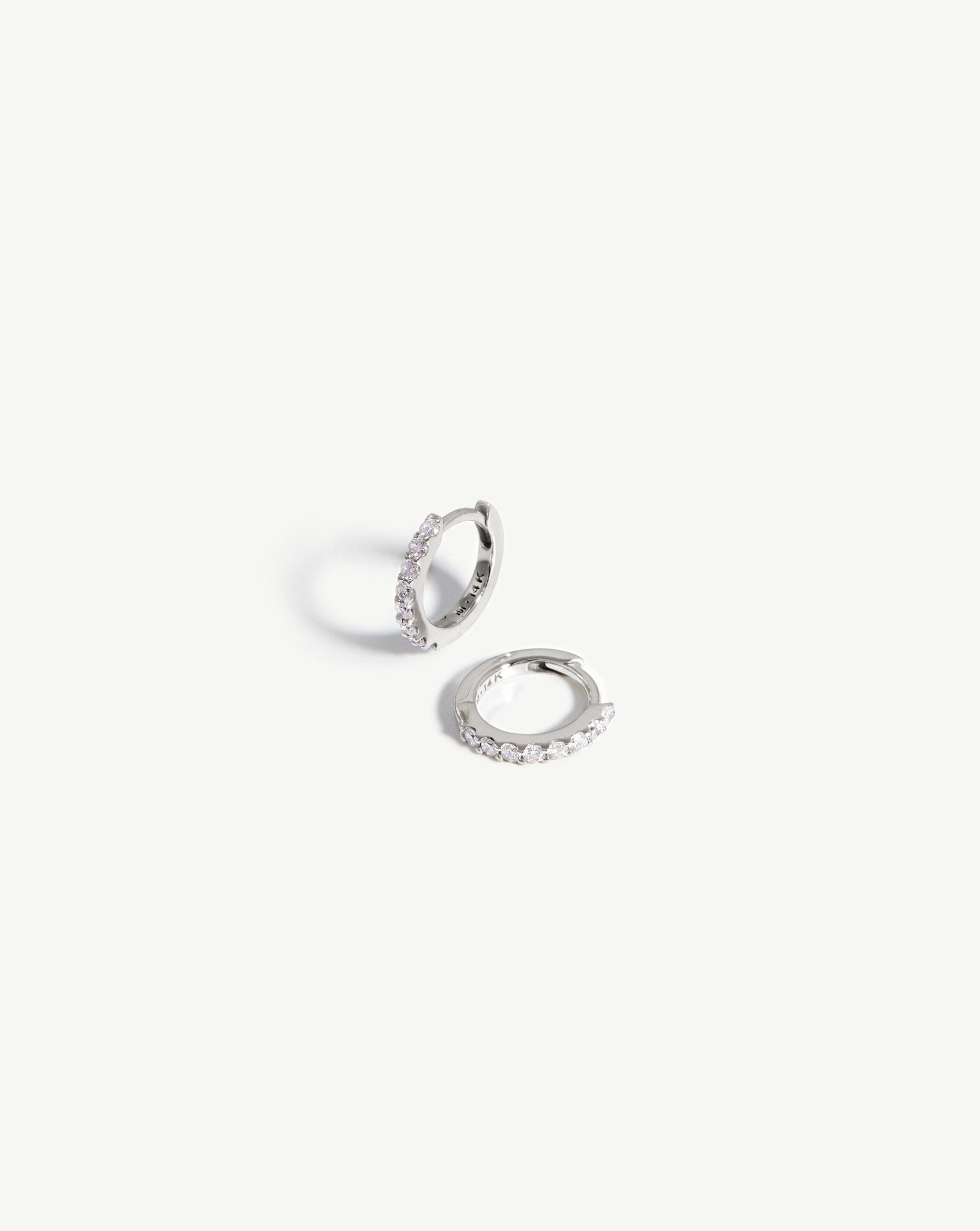 Crafted from 100% recycled 14ct solid white gold, these huggies are set with round cut white diamonds and open with a hinge. The go-to piece for a second or third piercing, you'll never have to take these off. The size of this earring is best for those with smaller lobes, or perfect for second or third piercings.