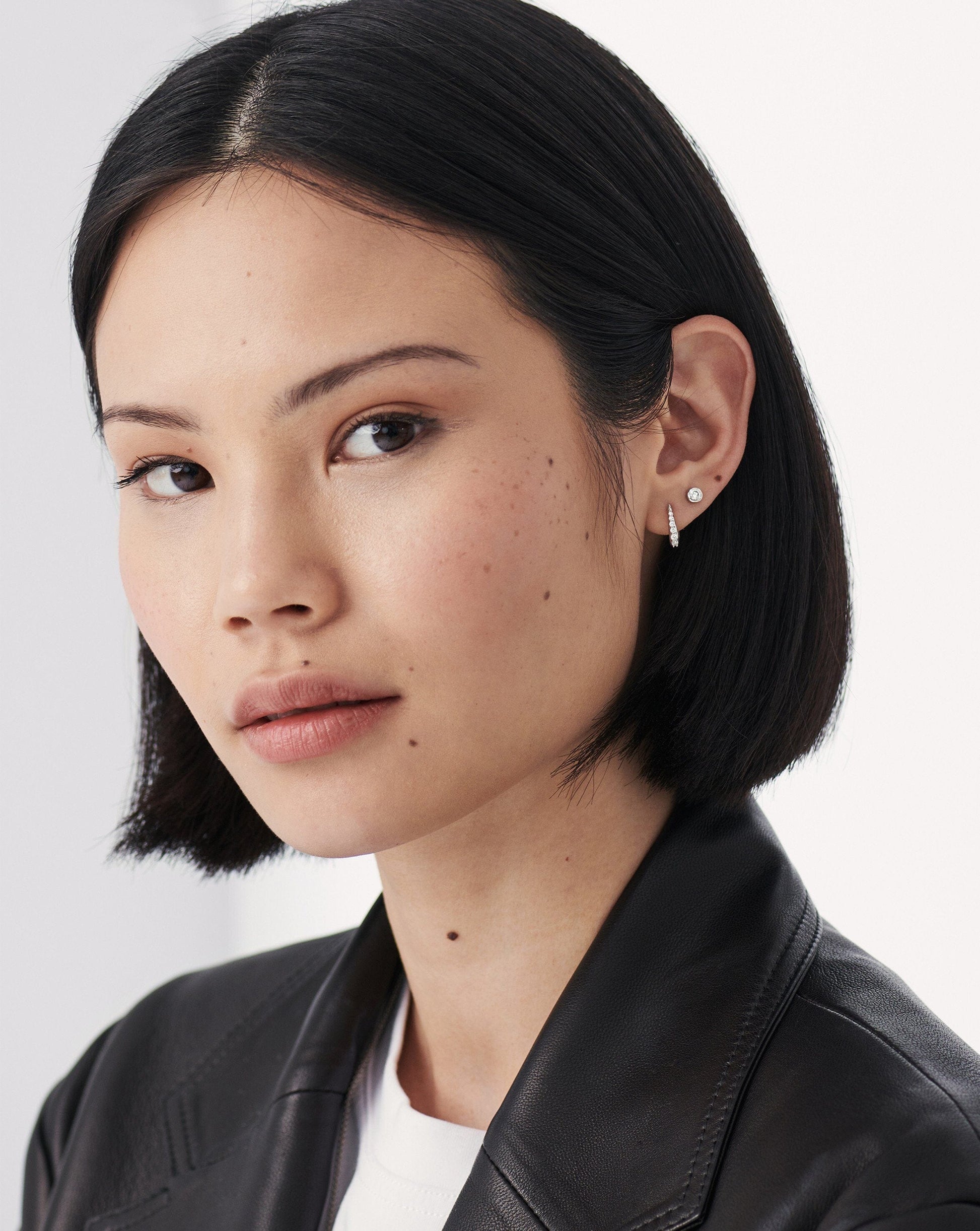 Our signature Claw huggie design, crafted in 100% recycled 14ct solid white gold. This mini hoop style opens with a hinge and is set with round cut white diamonds to one side for a subtle shine. The size of this earring is best for those with smaller lobes, or perfect for second or third piercings.